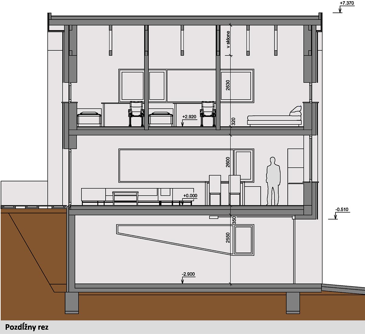 Chalet je prístupný zo severnej uličnej strany na úrovni suterénu. V suterénnej časti pozostáva z uzavretej garáže vedľa ktorej je z východnej strany navrhnutý hlavný vstup do objektu. Hlavným vstupom cez vnútorné jednoramenné schodisko je prístupné prvé nadzemné podlažie. Na prvom nadzemnom podlaží sa nachádza veľkometrážna otvorená miestnosť pozdĺž západnej strany podlažia, ktorá pozostáva z kuchyne, jedálne a obývacieho priestoru. Dané priestory dopĺňa samostatné WC. Z obývacej miestnosti je možné prejsť na vonkajšiu terasu situovanú do záhradnej časti z južnej strany. Ďalším schodiskovým ramenom ktoré sa tiahne pozdĺž východnej strany je možné prejsť do druhého podlažia. Zo spojovacej chodby sú prístupné dve izby a spálňa navrhnuté pozdĺž západnej strany podlažia. Vedľa spálne je navrhnutá kúpeľňa s WC v ktorej sa bude nachádzať aj práčka. Dané podlažie dopĺňa skladový priestor pri schodisku.